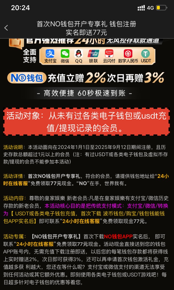 看清楚图片要求,2024--2025-09-12之间在平台注册的,且历史存款超过1+,满足这些条件后,no钱包必须是没用过,第一次注册的会员,绑定后给客服提供钱包地址申请77